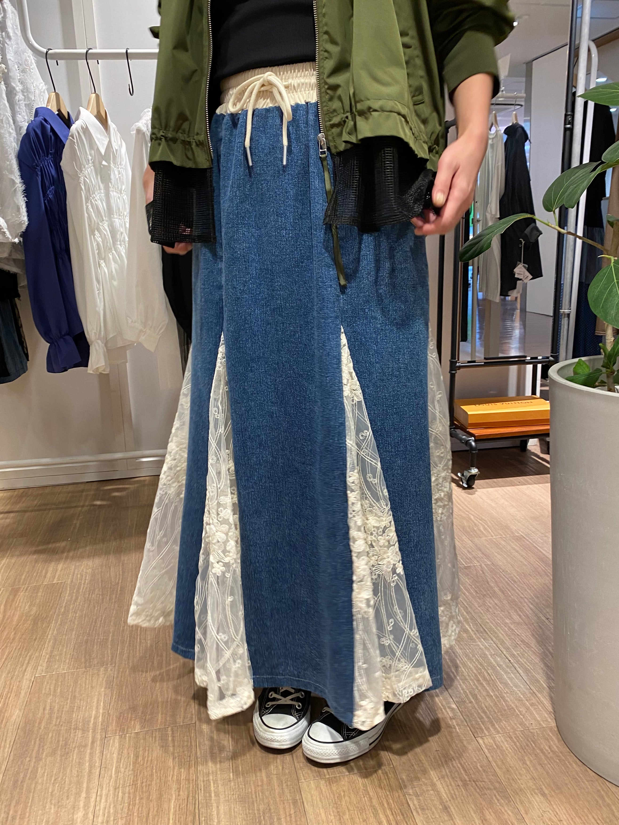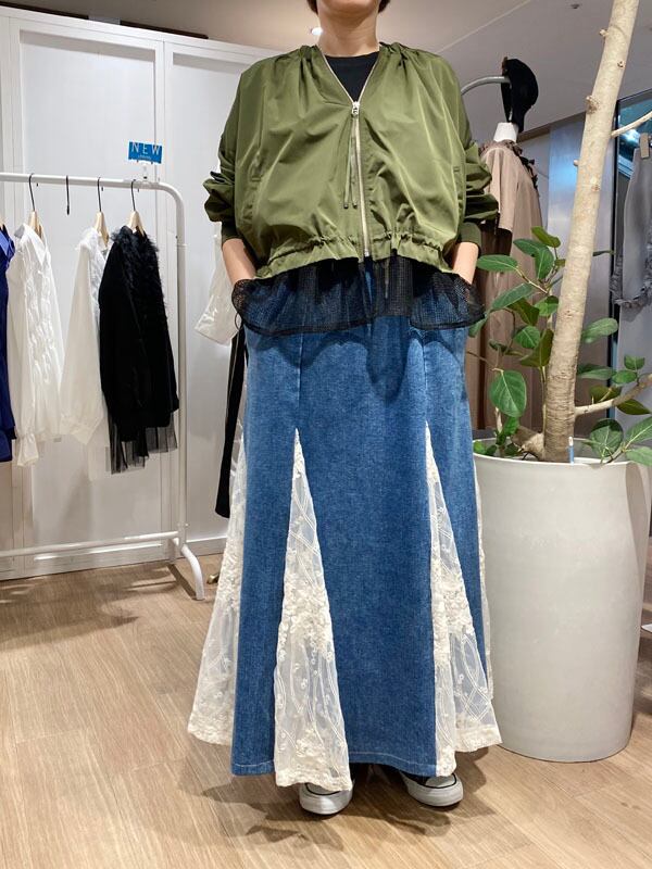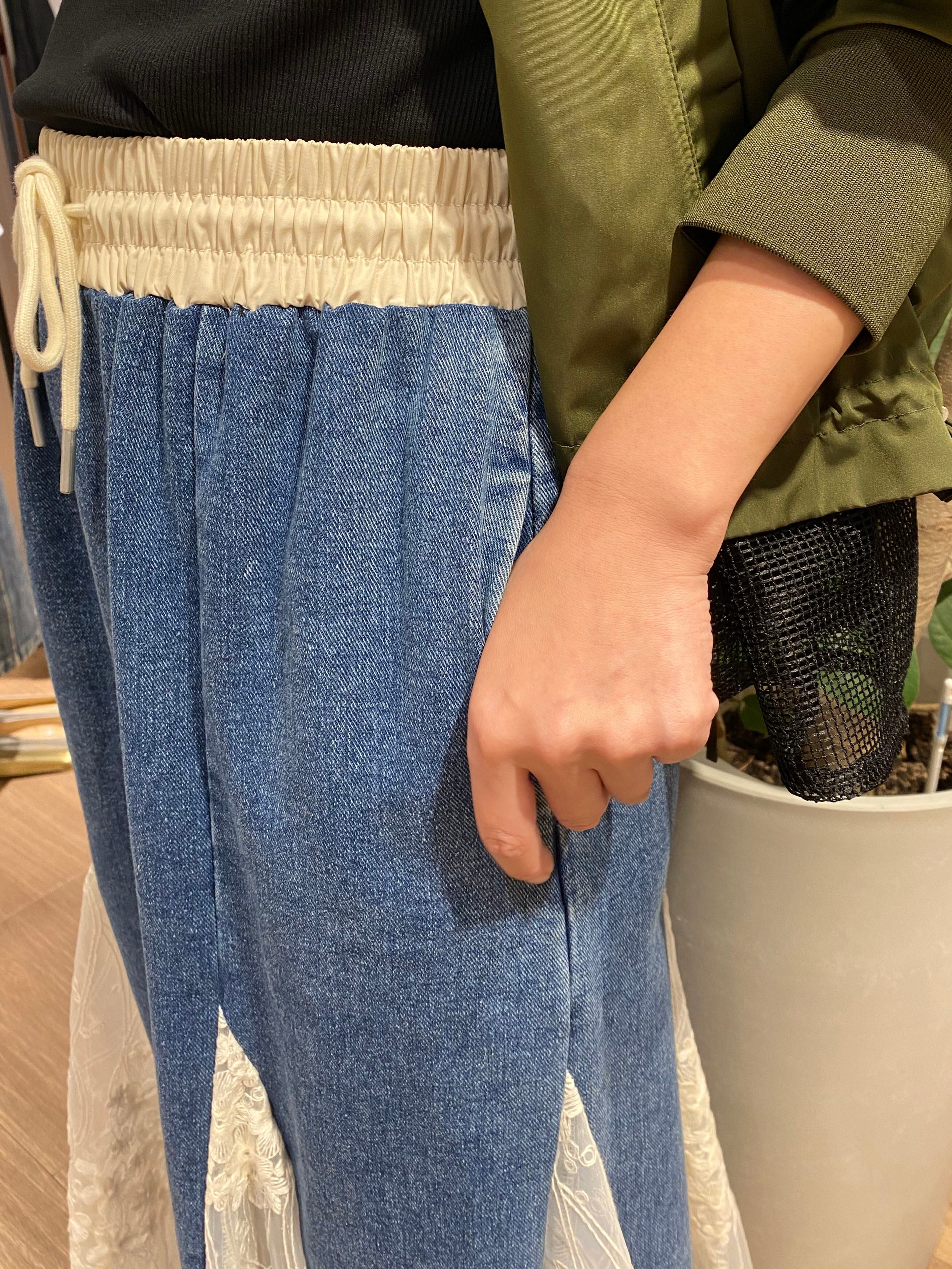 ▼Detail▼ マーメードラインが綺麗なデニムスカート。 切替レースが歩くたび靡いてとっても素敵です。 ウエストゴムで穿きやすいもも嬉しいポイント♪ ※店頭と同時販売しているため、完売している場合がございます。 その場合は、キャンセル手続きさせていただきますの あらかじめご了承ください。 ▼Size▼ 総丈66cm〜86cm ウエスト90cm 【素材・成分】 本体 ポリエステル100% モデル身長165cm