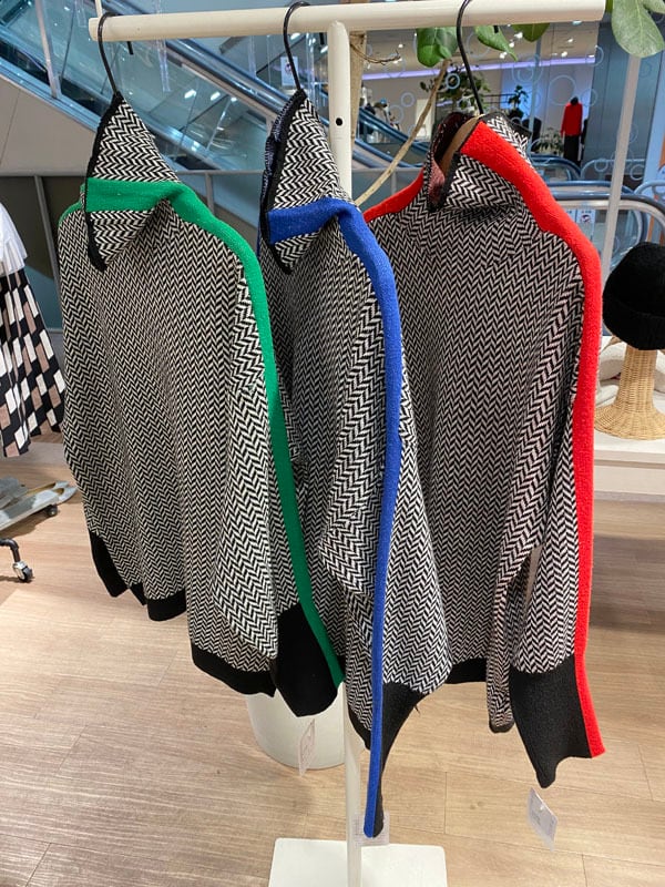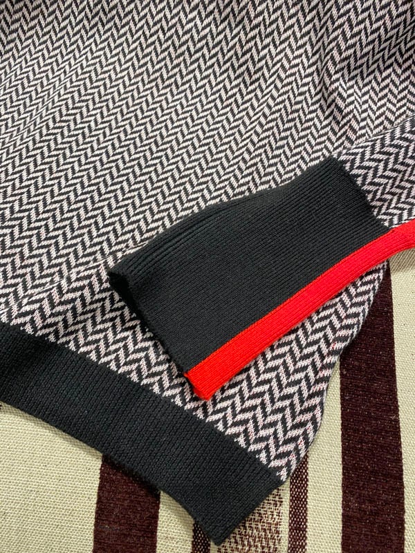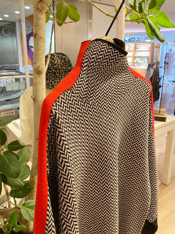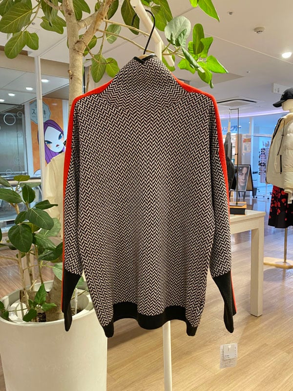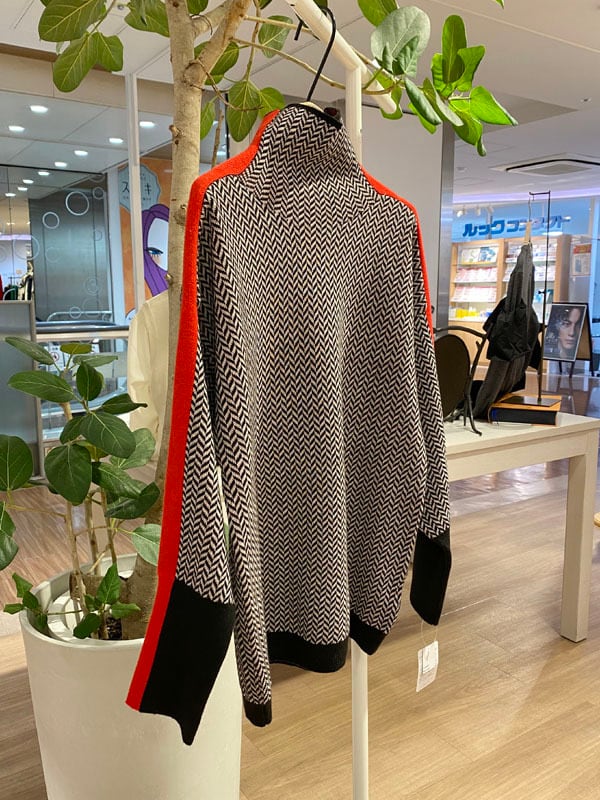 ハイネックのライン入りセーター。