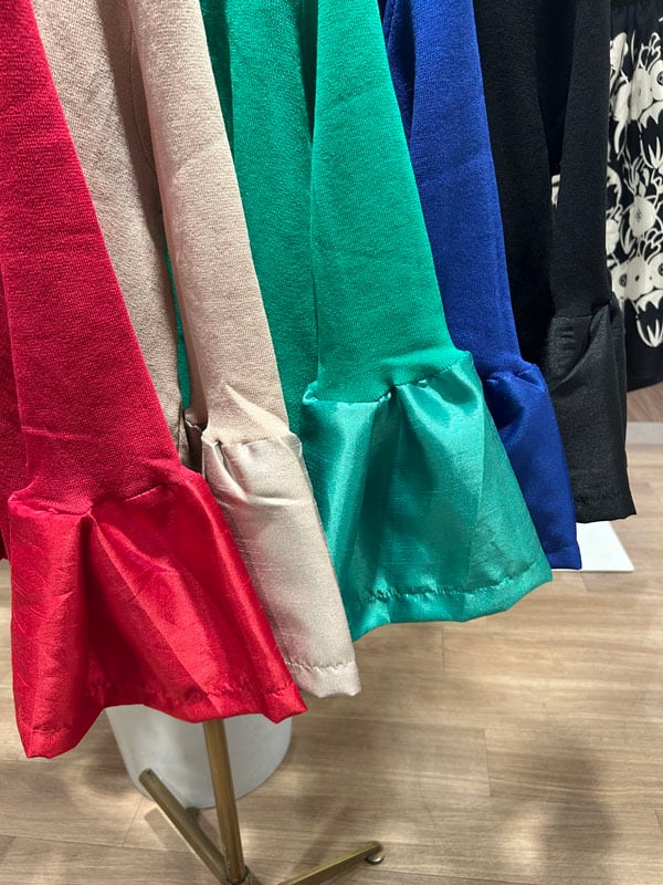 上品な光沢感と、ふんわり広がるフレア袖が女性らしい一枚。
