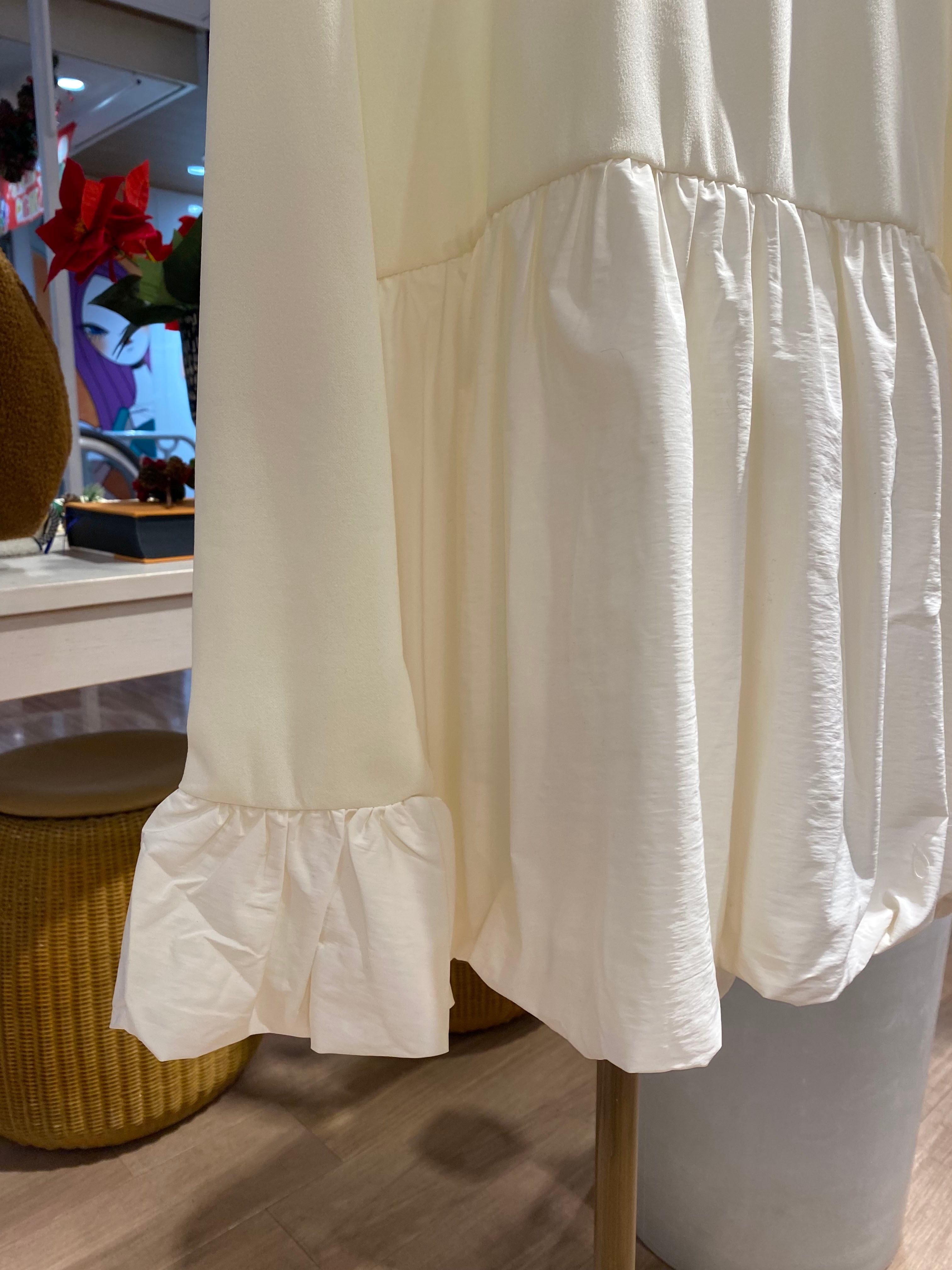 バルーンシルエットの裾がふんわりと広がり、フェミニンな印象を演出。