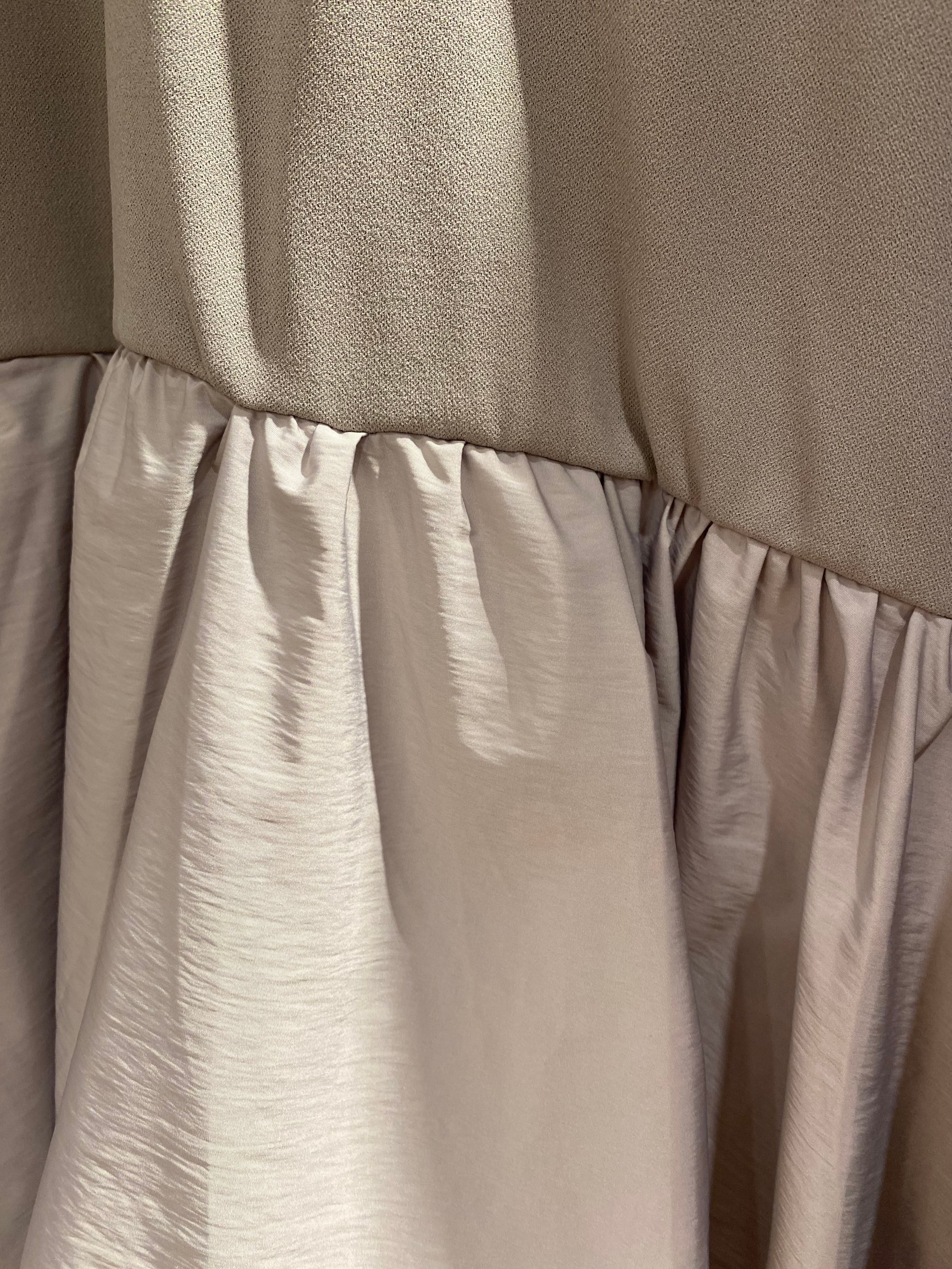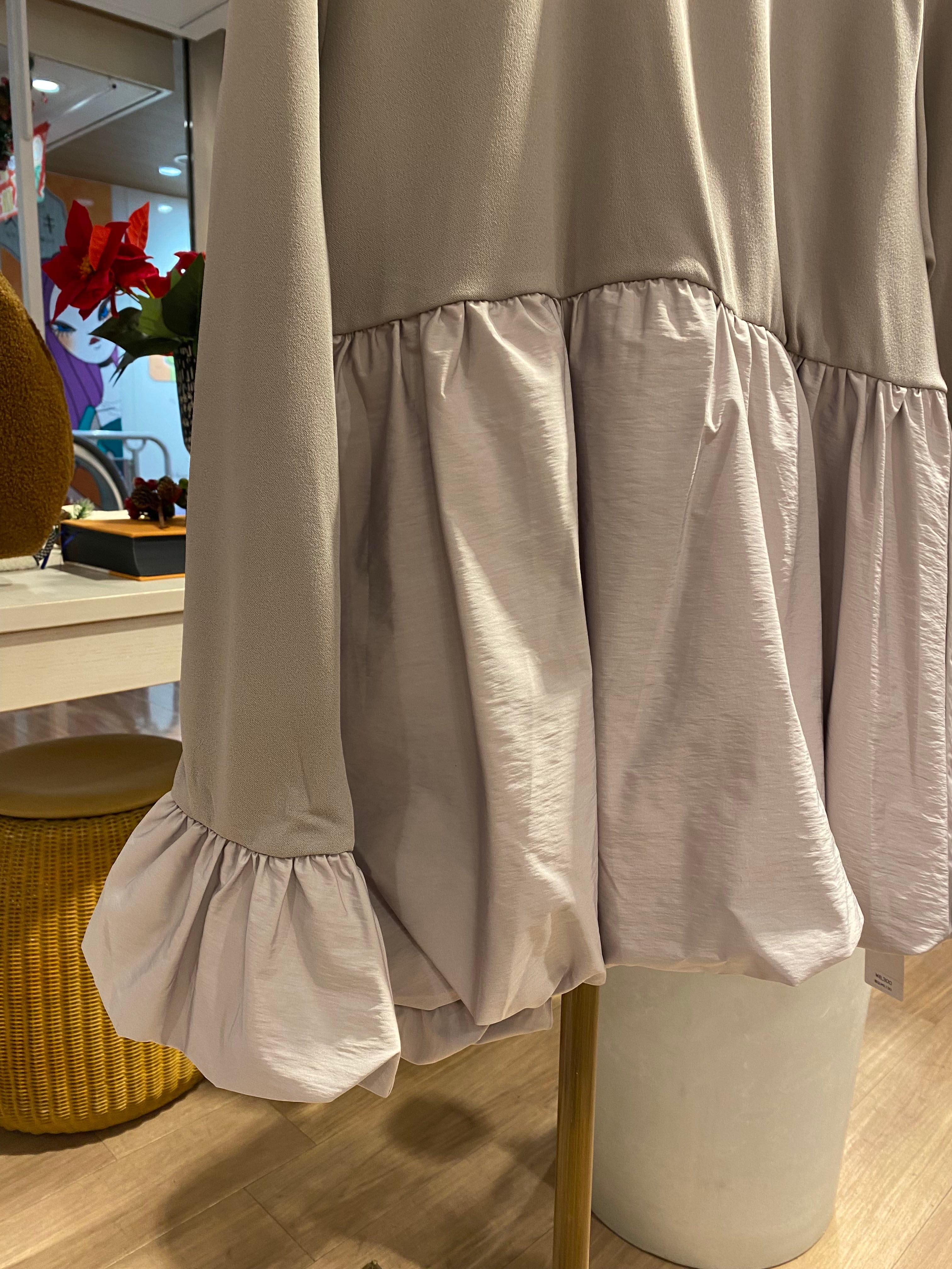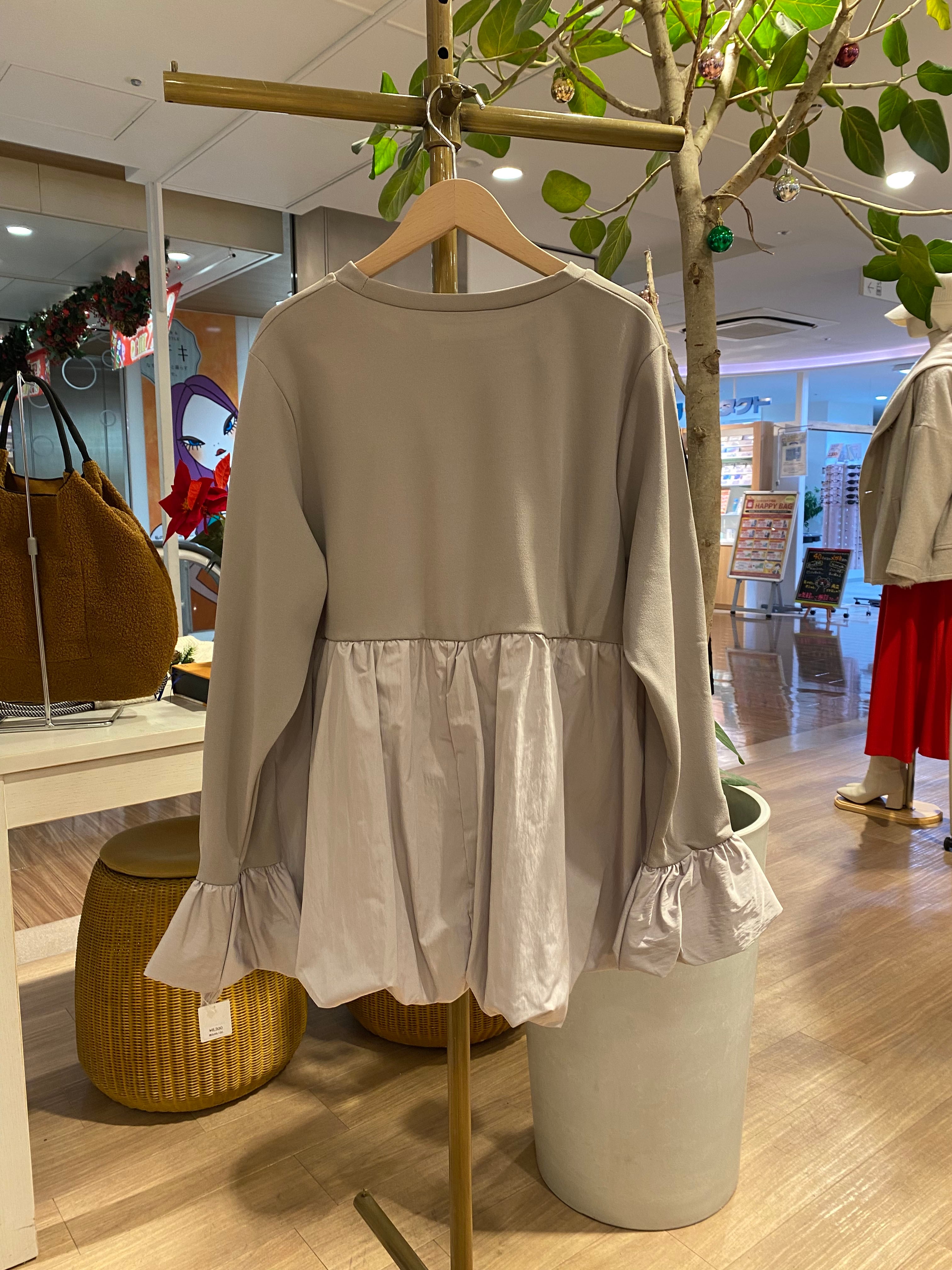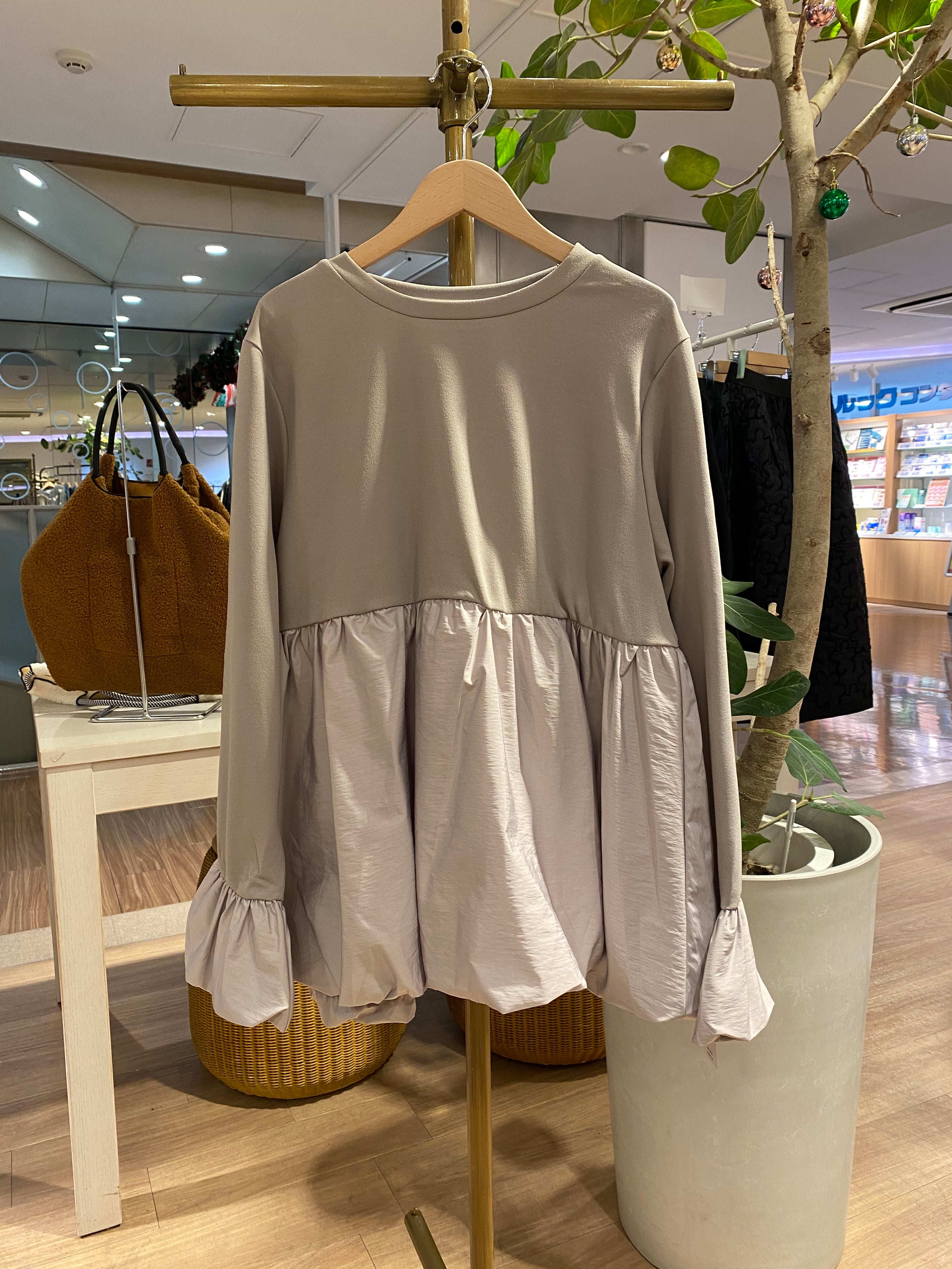 バルーンシルエットの裾がふんわりと広がり、フェミニンな印象を演出。
