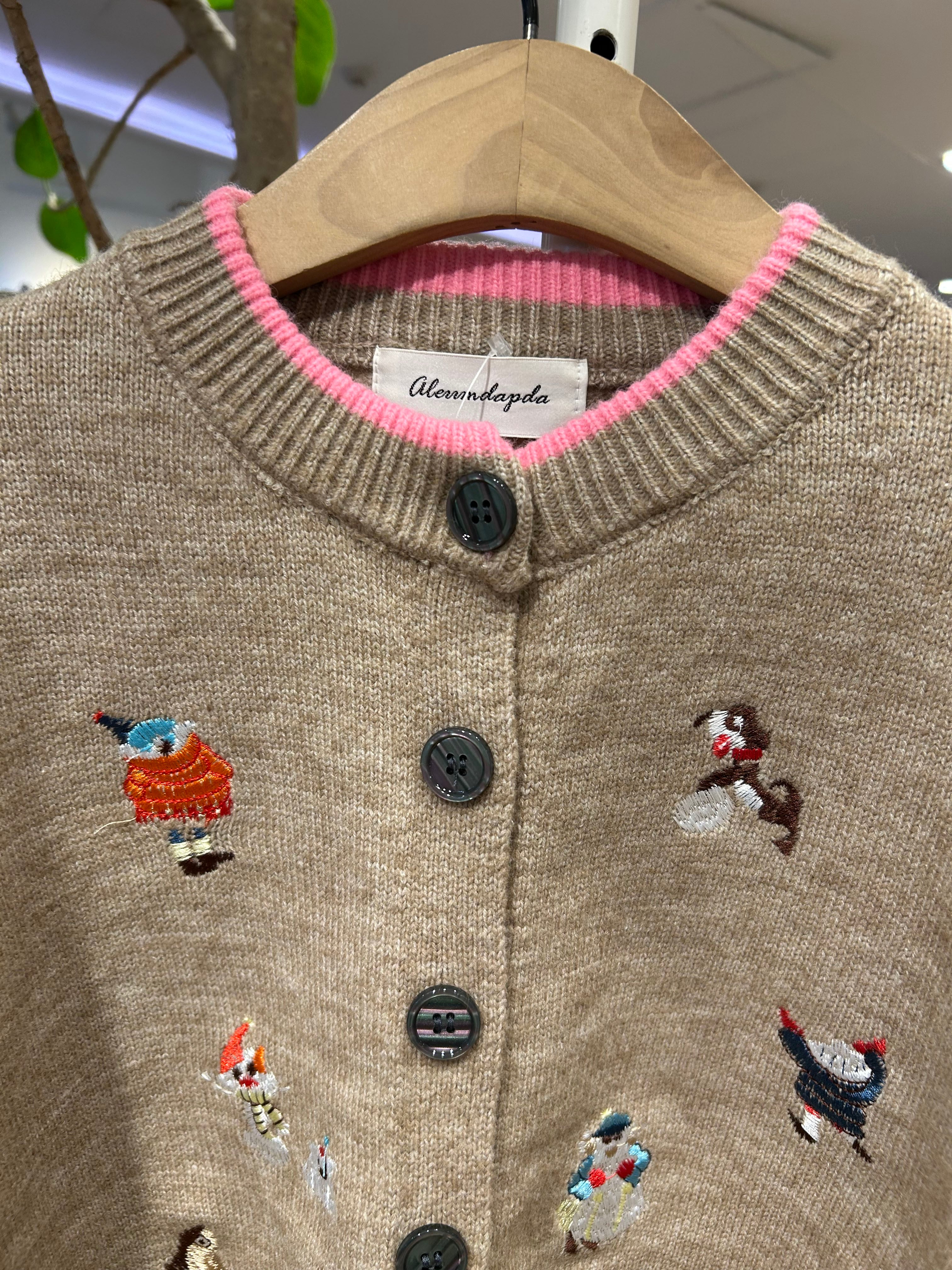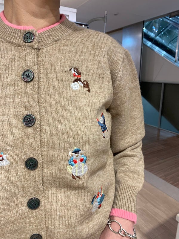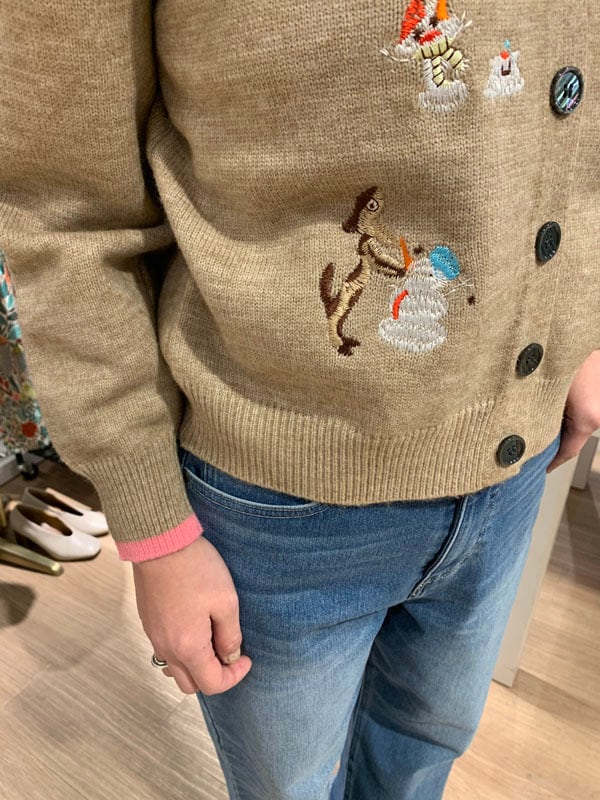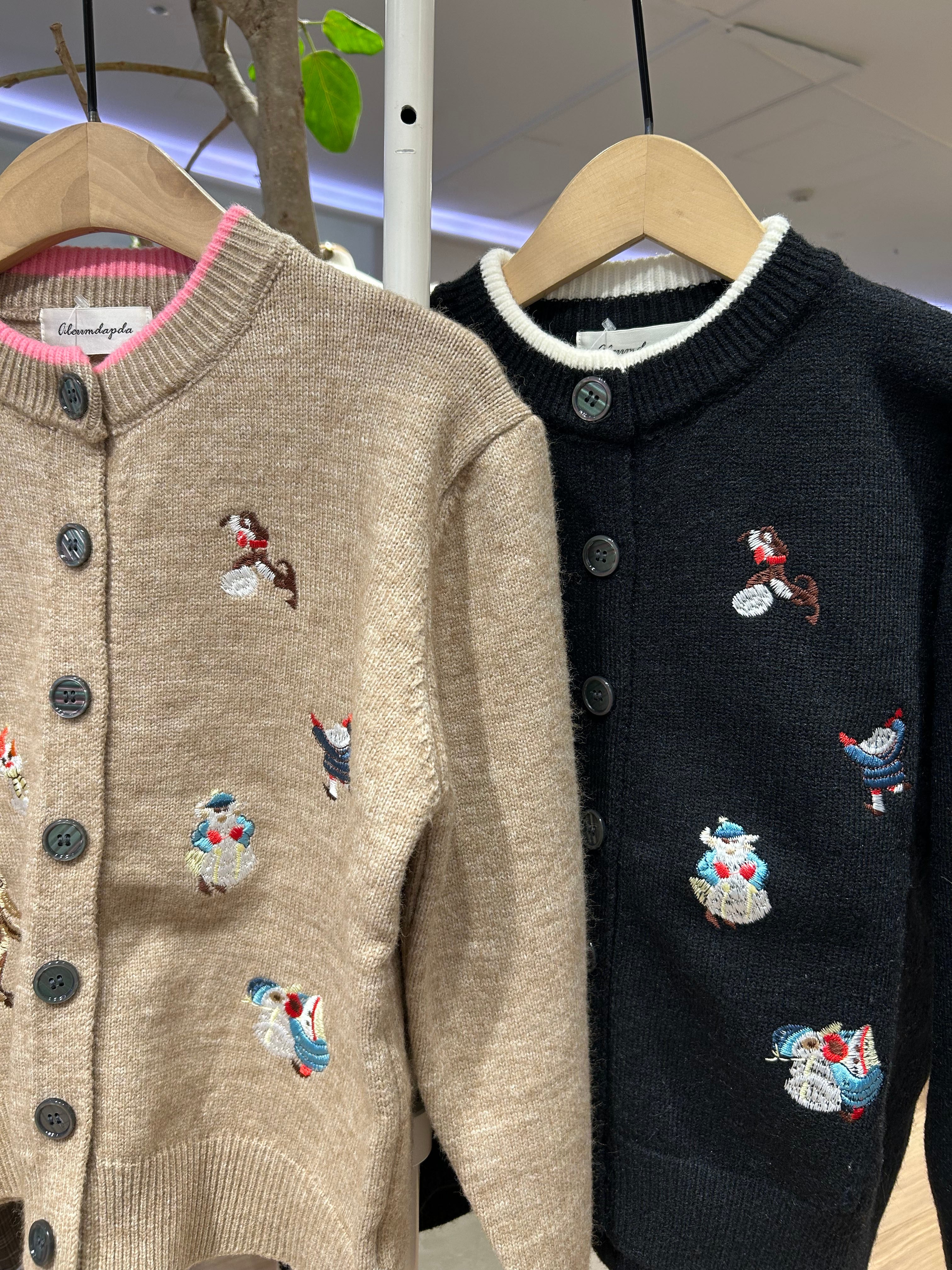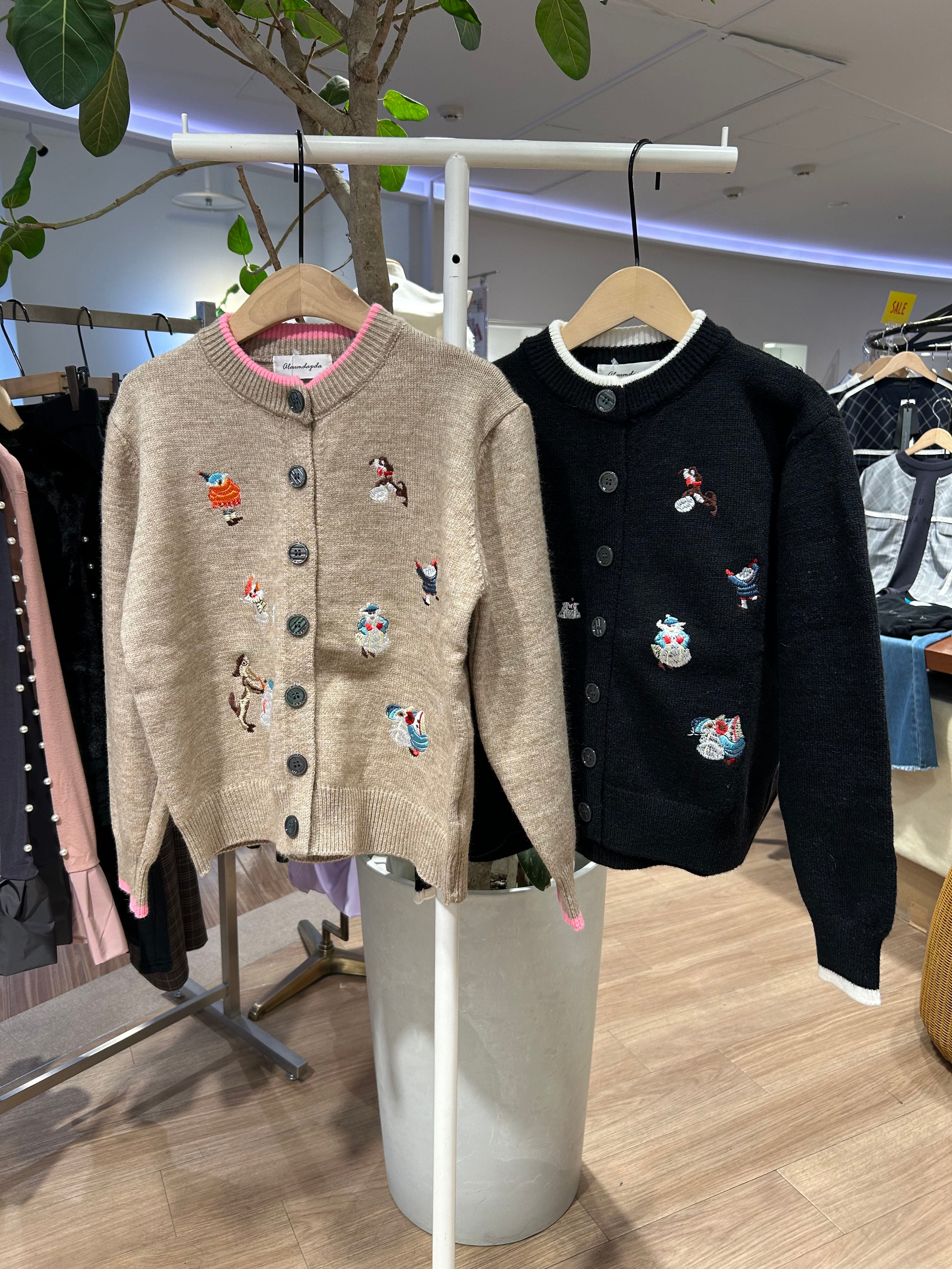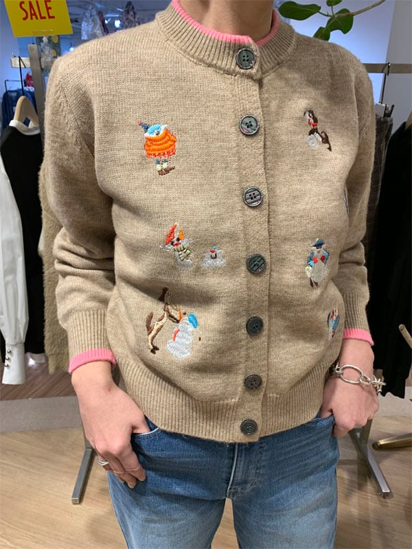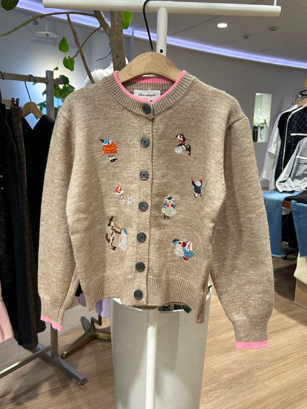 ユニークで愛らしい冬の妖精たちの刺繍が施されたカーディガン。